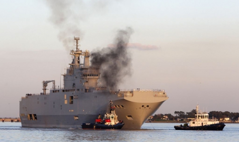 Договорът за сумата от 1,12 млрд. евро за строителство на самолетоносачи за Военноморските сили на Русия е подписан през юни 2011 г. Първият от тях трябва да бъде предаден на 1 ноември. Вчера обаче Оланд заяви, че страната му не е готова да го направи заради сложната ситуация в Югоизточна Украйна. От Елисейския дворец поясниха, че не става дума за юридическо разтрогване на договора и в течение на два месеца ситуацията може да се промени. В случай на неизпълнение на договорните задължения неустойките може да достигнат 3 млрд. евро.