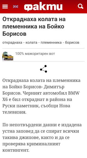 Защо завиждате на лидера Борисов!? Откраднаха джипа на племенника му през 2015 година ,чисто нов е закупен по поръчка за 1 млн.670 хил.евро.Подарък мй е от вуйчо му Борисов за рождения му ден.Коментиран от #26