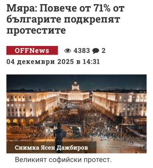 От бившия ГАЛЪП който купи Пеевски и те основаха МЯРА. Според председателя Първан Симеонов проучването е след първия протест на който имаше 25-30 хиляди а след огромния смята че вече над 80 процента подкрепят протеста и опозицията. Ще видим скоро и другите агенции21:13 04.12.2025