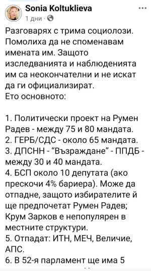 Според шефа на пиар отдела на Радев,Бареков партията им ще има 105-110 места. Влизат общо 6 партии. Радев 27%, ГЕРБ 17% ,ПП/ДБ 13% ,ДПС НН 9% и Възраждане и МЕЧ по 6%. По надолу БСП 3% ,Величие 1.9% и ИТН 0.6%. Също според Бареков министър на МВР в служ.правителство ще бъде Веселин Вучков бивш министър на вътрешните работи във второто правителство на Борисов който е запознат с всички схеми за купуване на гласове.