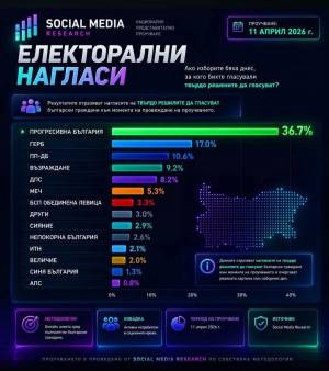 5-партиен парламент с много ясно изразен лидер - това сочи проучване, финансирано и реализирано съвместно от bTV и „Маркет ЛИНКС“. То е проведено сред 1003 лица над 18 г. в страната в периода 7-14 април 2026 г. по методите на пряко-лично интервю и онлайн анкета.