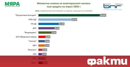 Данните са на „Мяра“ за Българското национално радио. Изследването е представително за пълнолетното население в България и е реализирано между 4 и 13 април 2026 г., като интервютата са проведени „лице в лице“ с таблети сред 1002 пълнолетни български граждани. Максималната стохастична грешка е ±3,1 при 50% дялове. 1% от цялата извадка (а не от гласуващите) се равнява на близо 54 000 души.