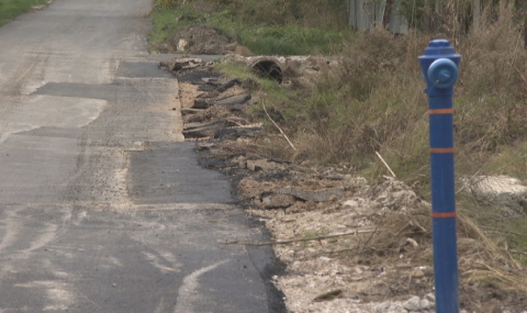 Канавка в проекта дори не е заложена. Докато бригадата полага настилката, заради тежестта на валяка част от вече готовия път пропада.