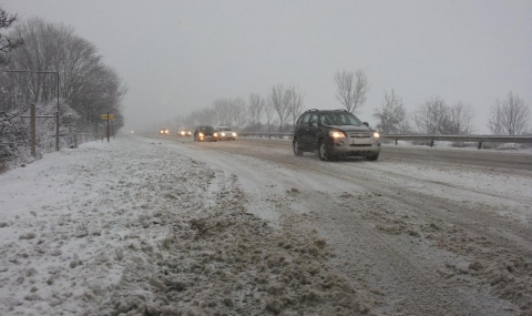 - АМ ,,Хемус” - пътната настилка е заснежена, превалява сняг.