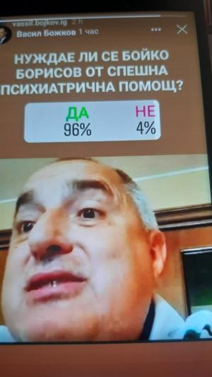 Видях в профила на Божков анкетата. До момента са гласували над 2 хиляди човека и 96% са гласували с "ДА". Ние от жеронимо гласувахме с "НЕ". Бойко е нормален като нас. Не трябва да бъде въдворяван в психиатрична клиника...Коментиран от #30
