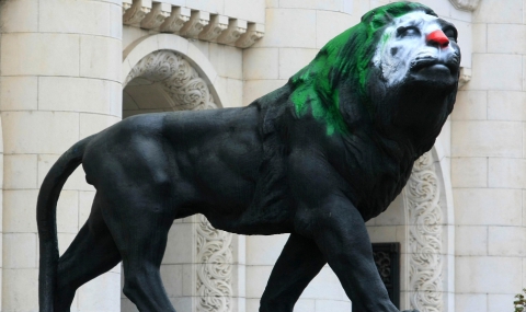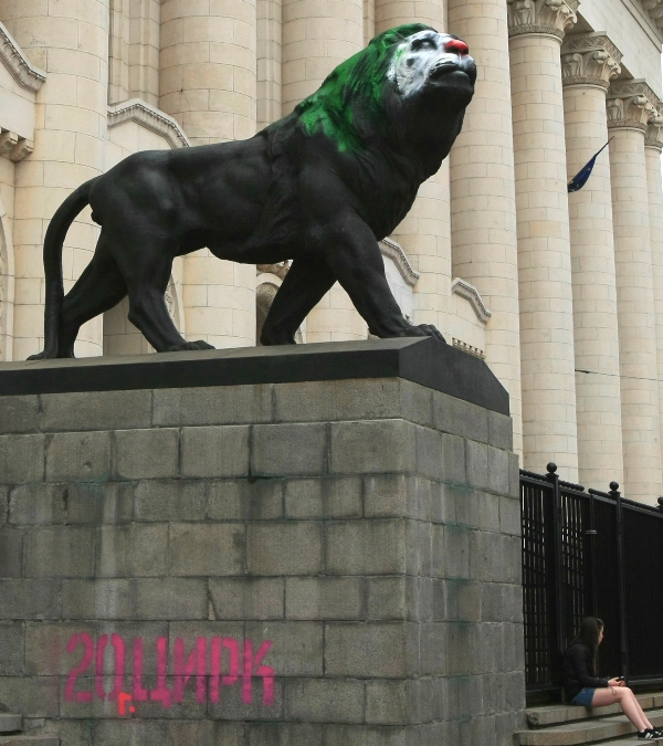 Единият от двата лъва пред Съдебната палата в София осъмна тази сутрин изрисуван като клоун.