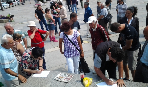 Около стотина души се събраха и днес край пилоните на НДК, за да изразят подкрепа за правителството на Пламен Орешарски. Те продължиха да събират подписи в защита на кабинета, както и за оставката на президента Росен Плевнелиев, който според участниците в проявата разделя нацията.