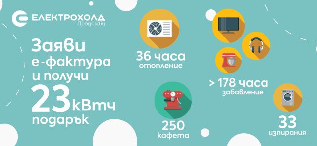 От 1 до 14 февруари 2023 г. близо 4 000 клиенти на Електрохолд Продажби заявиха електронна фактура и спечелиха по 23 безплатни киловатчаса. В рамките на кампанията „23 кВтч подарък“ всеки клиент на дружеството, който заяви е-фактура, получава като подарък себестойността на 23 киловатчаса електроенергия във втората си електронна фактура, издадена след регистрацията за услугата.