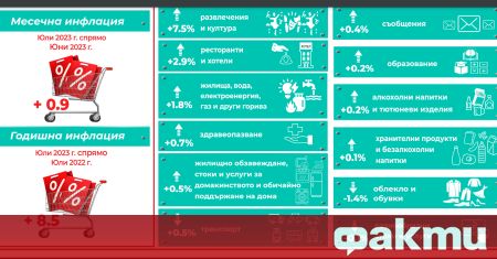 През юли 2023 г. месечната инфлация, измерена с индекса на потребителските цени (ИПЦ), е 0.9% спрямо предходния месец, а годишната инфлация за юли 2023 г. спрямо юли 2022 г. е 8.5%. Това съобщава НСИ-