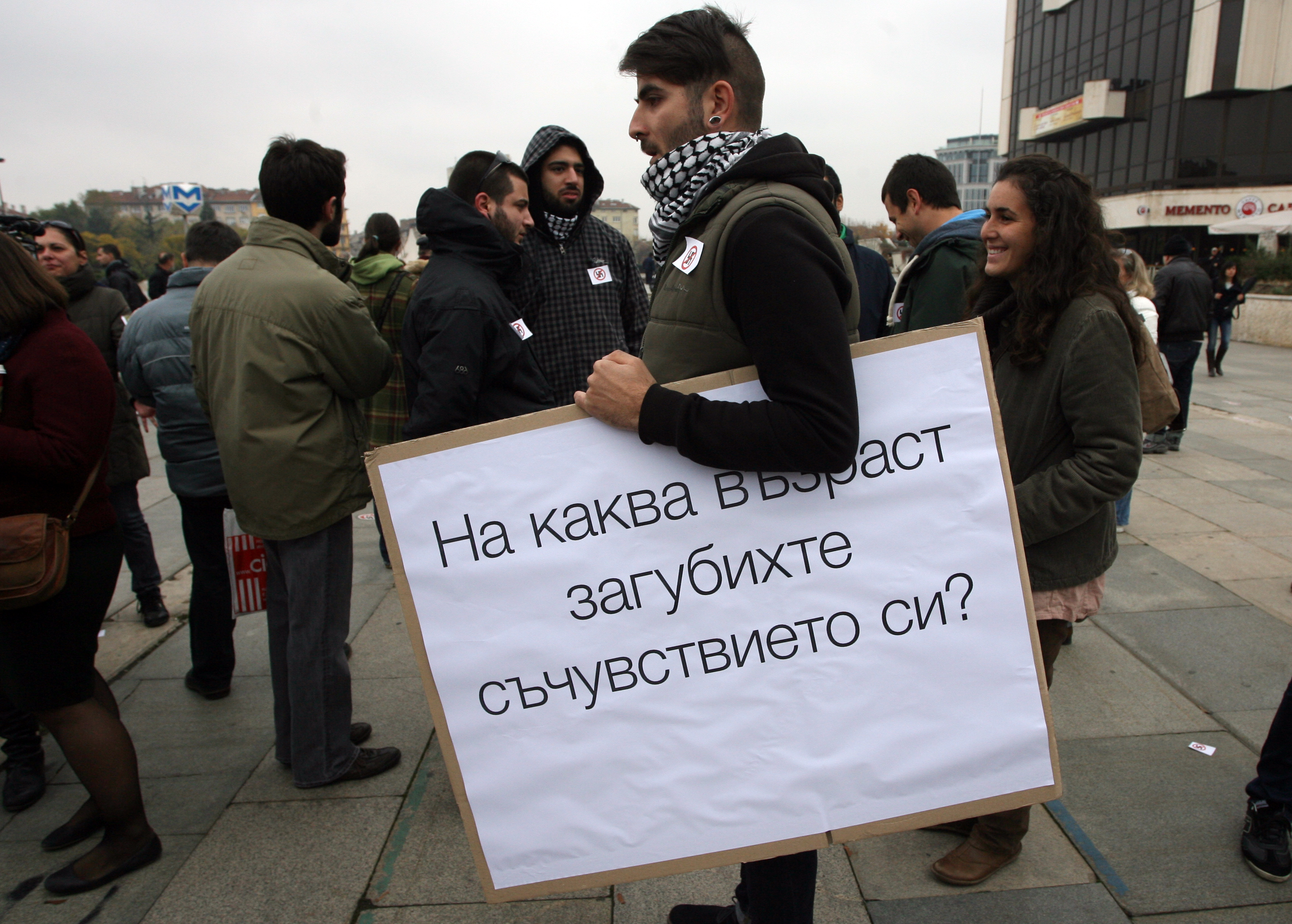 Събралите се, повечето от които са млади хора, издигнаха плакати „Фашизмът убива, властта прикрива”, „Фашизмът не е мнение, а престъпление!” и скандират „Не на омразата”.