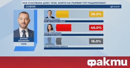 Според данните на агенцията 38% от гласувалите за Антон Хекимян (ГЕРБ-СДС) са подкрепили Васил Терзиев, а 46% - Ваня Григорова. 16% от гласувалите за кандидата на ГЕРБ-СДС на първия тур са отбелязали "Не подкрепям никого".
