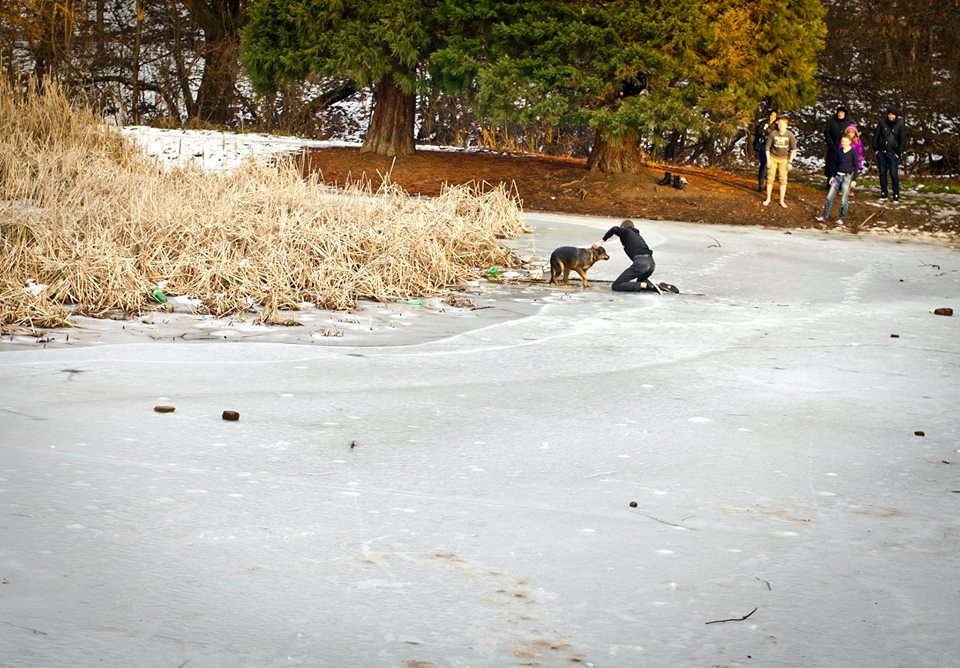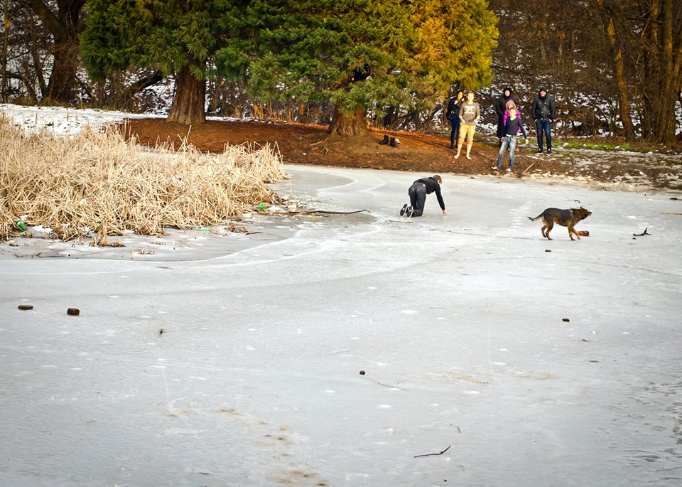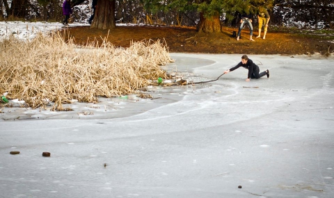 Групичката тийнейджъри се събували и събличали в явен опит да помогнат на кучето. След кратък размисъл излъчили най-лекия от тях, който изпълзял на четири крака по леда и подал клон към кучето, за да го измъкне. В крайна сметка опитът бил успешен.