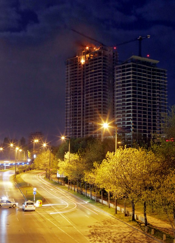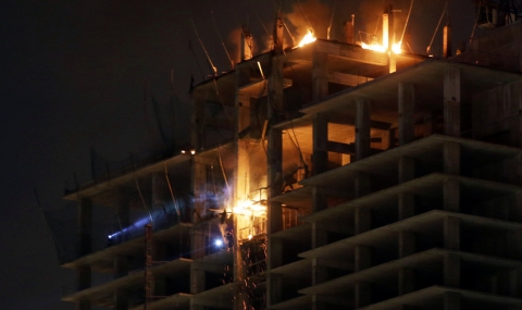 Голям пожар гори на върха на новострояща се сграда срещу НДК, предаде репортер на Факти.бг.