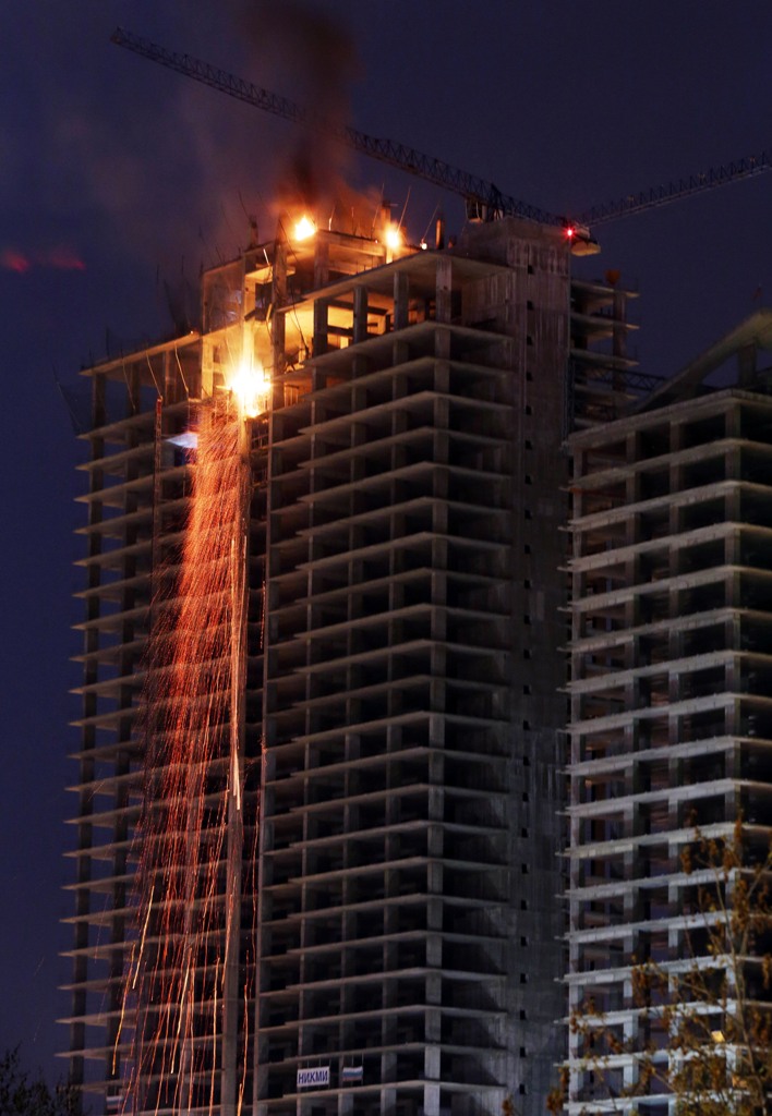 Пожарът е тръгнал от дървен кофраж на един от последнте етажи на сградата, стана ясно по-късно. Горящи отломки падаха от сградата.