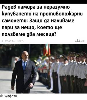 „Не може да налеем толкова средства за техника и подготовка в МВР за хора, които ще бъдат нужни само два месеца. Затова апелирам за държавнически подход за изразходването на всеки един лев“, каза президента Румен Радев по повод идеята да бъдат купени самолети за гасене на пожари.