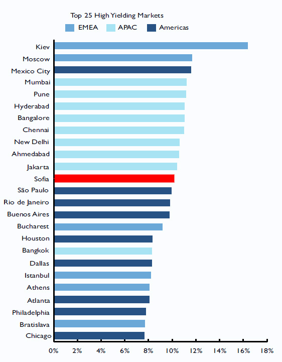 Пазарът на офис и бизнес имоти през последните три-четири години безспорно е в затруднено положение, подобно на останалите сегменти от недвижимите имоти. Един от елементите, върху които се отразява е доходността. В следствие на световната икономическа криза София вече е на 12 позиция в световната класация за най-високи нива на доходност по отношение на инвестициите в бизнес имоти, сочат данните на компания Cushman&Wakefield, представена у нас от Forton International.