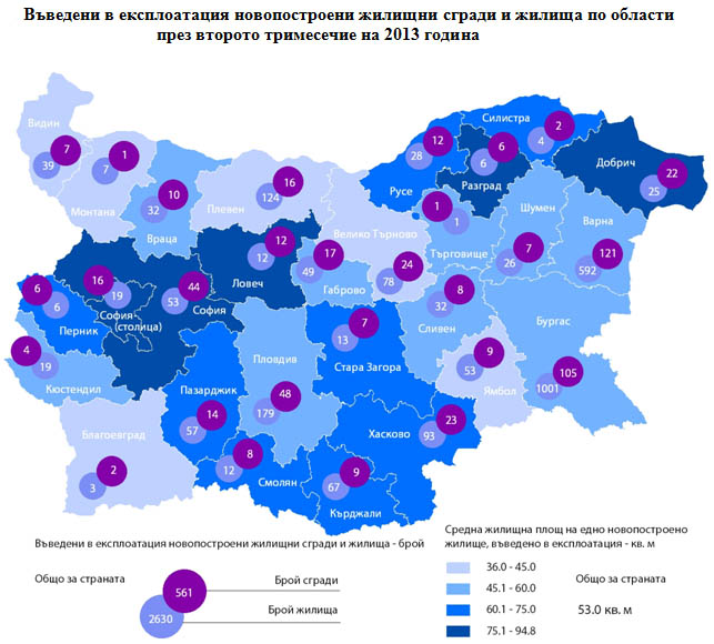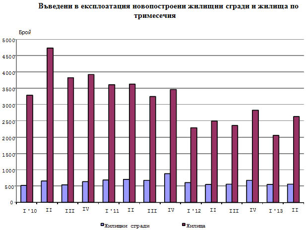 Броят на въведените в експлоатация новопостроени жилищни сгради през второто тримесечие на 2013 г. е 561. За сравнение през първите три месеца на настоящата година техният брой е бил с 9 повече, което прави минимален ръст от 1.6% на месечна база. Броят на жилищата в тях е с 134 апартамента повече в сравнение първото тримесечие, или ръст от 5.4%, сочат данните на Националния статистически институт (НСИ).