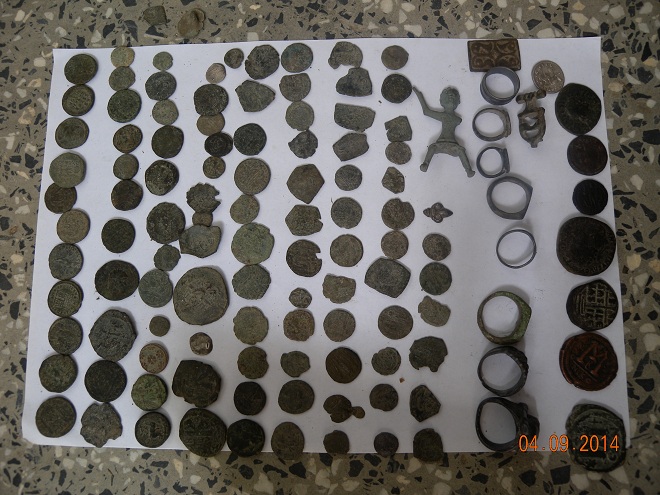 Намерени и иззети са и седем старинни пръстена, 12 старинни монети с видими изображения и надписи и 100 монети с неправилна форма с трудно определящи се надписи и изображения.