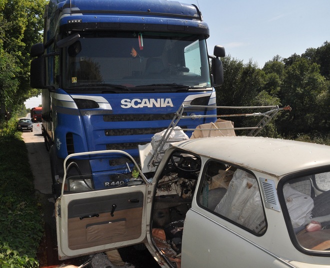 Предната греда на трабанта доста сериозно бе огънала предницата на потърпевшия тир. Не че камионът няма да се движи, но определено се нуждае от ремонт.