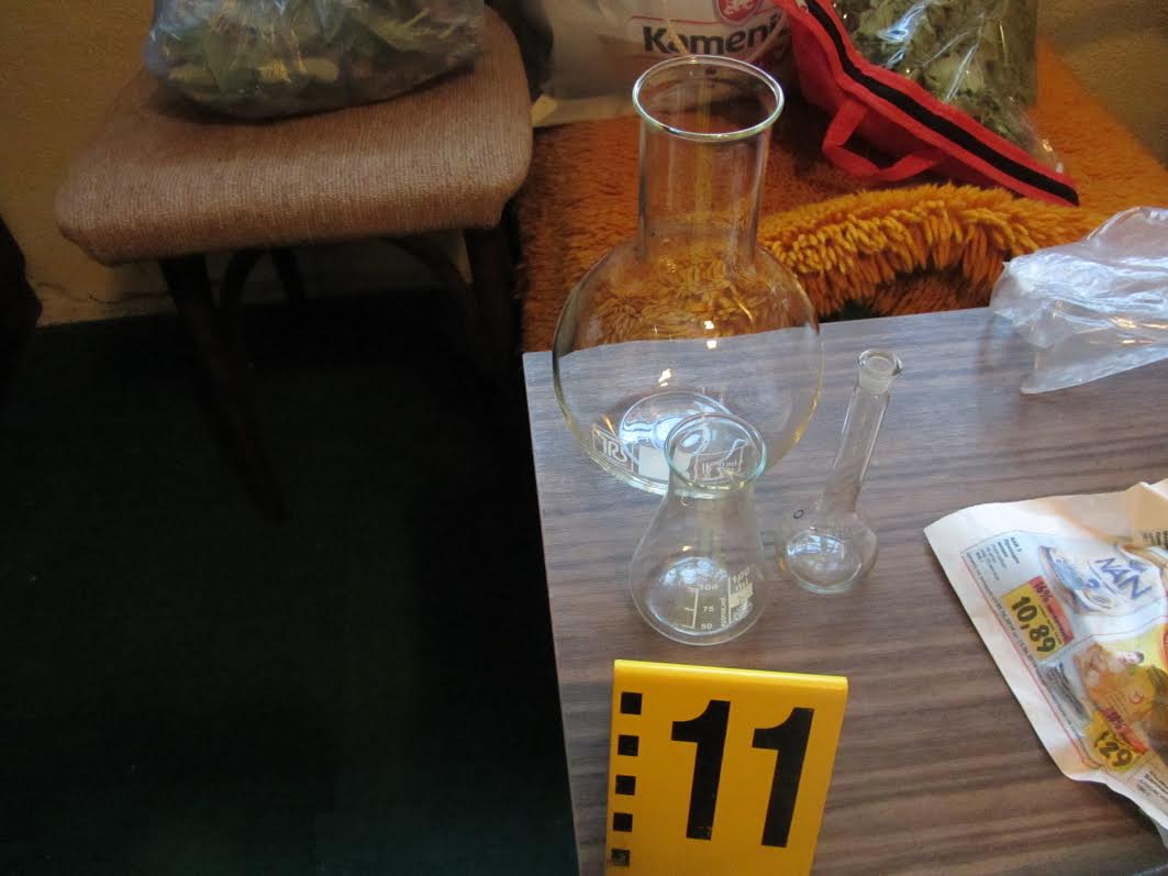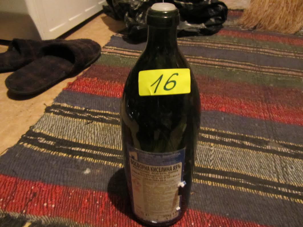 При извършено претърсване в къщата са открити: около 1 кг. синьо-бели таблетки, около 500 гр. бяло прахообразно вещество с неустановен произход, около 10 гр. суха зелена тревиста маса, която при тестване с полеви наркотест реагира на марихуана, жълта пластмасова кутийка съдържаща жълтиникаво прахообразно вещество, около 3 гр., реагиращо при тестване с полеви наркотест на наркотично вещество, 16 бр. таблетки "Хюмекс", около 100 гр. бяло прахобразно вещество реагиращо на метаамфетамин, 14 колби с различна вместимост, стъклена бутилка с вместимост 1 л. съдържаща фосфорна кисилина, две 3-литрови туби, съдържащи кафеникава течност, бутилка от 1 л., съдържаща солна киселина, 3 пластмасови бутилки по 1,5 л. съдържащи двуслоен разтвор за извличане на амфетамини, 1 л. бутилка с разтворител "ТМ" и множество други различни по вместимост съдове, съдържащи химични вещества.