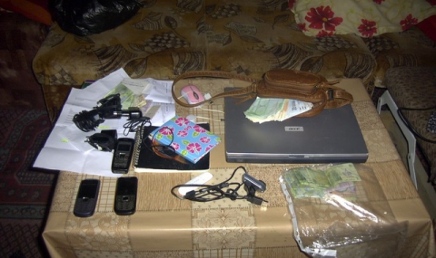 В хода на процесуалните действия са намерени и иззети два лаптопа, компютърна конфигурация, 7 мобилни телефона и 11 симкарти, 3 тетрадки и 30 листа с имена на чужди граждани, интернет адреси на сайтове, скайп - адреси и мобилни телефонни номера, парични средства в различа валута и чуждестранни вестници за запознанства.