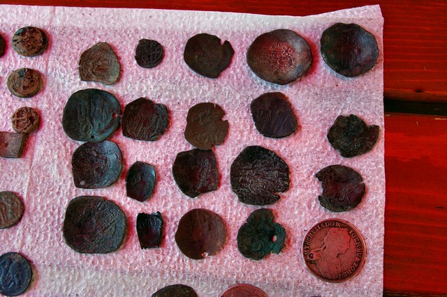 При предприетите претърсвания на двете коли и в тримата мъже са открити 125 монети от бял и жълт метал, накити и метални орнаменти, керамична купа, камък с човешко изображение. Намерени са лупи, електронна везна, кирки и лопати, иззети са и мобилните им телефони.