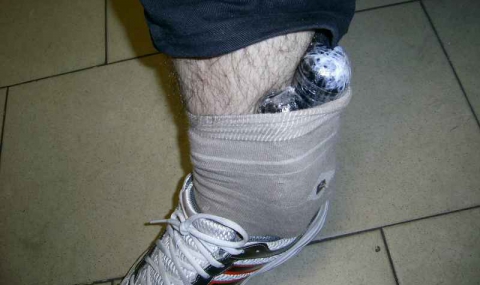 При личен преглед на един от пътниците – ирански гражданин, живеещ в Румъния, митничарите откриват под чорапите му, увити около глезените по два найлонови пакета.