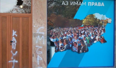Точно под фотоса на група българи с надпис "И аз имам права" хулигани написаха "Смърт", а край входа са издраскани обидни епитети.