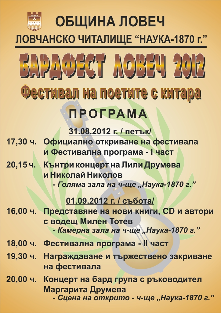 В петък и събота Ловеч ще е домакин на 12-ото издание на „Бардфест Ловеч”, който ще се проведе в Ловчанско читалище „Наука-1870”. Участват 27 поети с китари, 24 от България, един от Русия и двама от Англия.