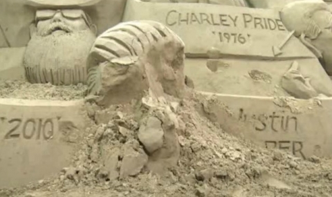 Огромна пясъчна скулптура бе създадена за изложение в Ню Йорк, но по всичко личи, че едното от лицата на нея не е понравило на американец.