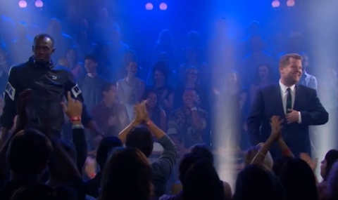 Ямайският лекоатлет Юсейн Болт се включи в рап батъл срещу телевизионния водещ Джеймс Кордън.