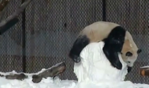 Пандата се покатери върху снежния човек, а по-късно се просна на земята и овъргаля в снега.