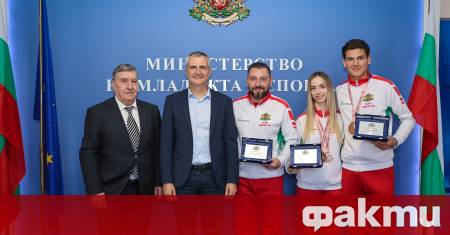 Министърът на младежта и спорта Димитър Илиев награди Марияна Узунова и Калоян Петров за представянето им на Европейското първенство по скокове на батут в Портимао, Португалия.