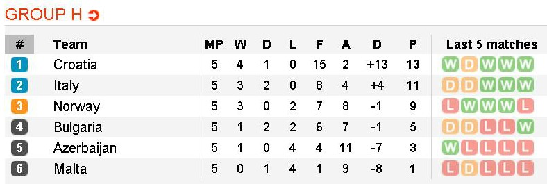 Хърватия приема Италия в пряк сблъсък за първото място (разликата между двата тима е 2 точки в полза на хърватите), докато Норвегия ще търси успеха срещу Азербайджан.