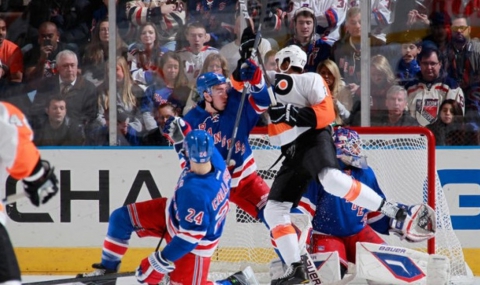 Майк Руп вкара два гола, а шведският вратар Хенрик Лундквист хвана важна дузпа на Дани Бриер 19 секунди преди последната сирена за победа на Ню Йорк Рейнджърс с 3:2 над Филаделфия в класическия зимен мач от Националната хокейна лига на САЩ и Канада (НХЛ).