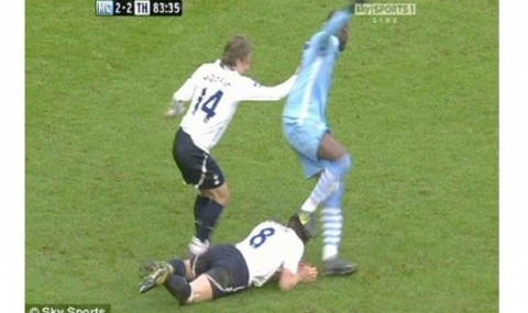 Уж случайно, италианският нападател на "гражданите" стъпка главата на падналия си съперник от „шпорите” Скот Паркър.