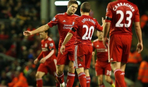 В 40-ата минута домакините от Ливърпул получиха дузпа за игра с рака на Майка Ричардс. Зад топката застана капитанът Стивън Джерард и не сбърка за 1:1.