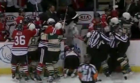 Сбиването започна няколко секунди преди края на мача и играчите се млатиха както на леда, така и на резервната скамейка: