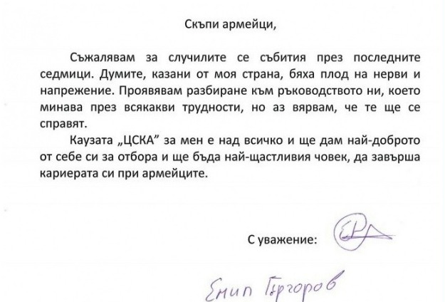 Основна причина за разтрогването на договора на Гъргоров бяха няколко неизплатени заплати. Преди няколко дни футболистът заяви, че възнамерява да се върне в отбора след разговор със Стойчо Младенов и сега пусна официално извинение към ръководството в сайта на ЦСКА.