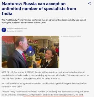 През 2026 година в Русия ще дойдат на работа десетки хиляди граждани на Индия, заяви представителят на президента в областта на устойчивото развитие Борис Титов. При това по официални данни в края на 2025 г. в Русия вече са работили между 70 000 и 80 000 индийци.