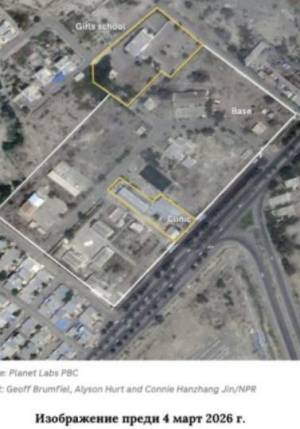 в иранска военна база? На снимката е показана военната база оградена с бяла линия. С жълти линии са оградени девическото училище и поликлиниката в двора на базата. Кой луд строи такива учреждения във военна база? Снимката е преди удара.Коментиран от #101