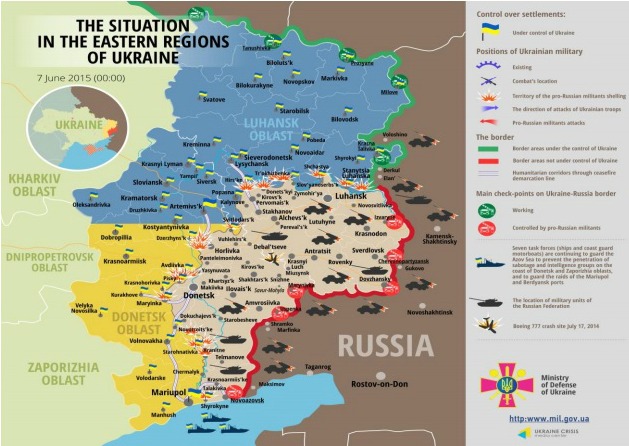 През деня на 6-ти юни е продължило обстрелването на украинските позиции в зоната със 122-милиметрови артилерийски системи и 120-милиметрови минохвъргачки. В сектора Артемивск са били използвани артилерийски системи, за да се обстрелват селата Лининск и Луханск. Селото Широкин край град Мариупол е било на два пъти обстрелвано с монтирани гранатомети и леко стрелково оръжие. Организацията за сигурност и сътрудничество в Европа (ОССЕ) съобщават, че сепаратистите продължават да не позволяват достъп до окупираните територии.
