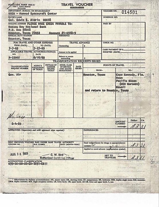 Бъл Олдрин, който е вторият човек стъпил на Луната на 20 юли 1969 г. , показа на страницата си във Фейсбук своето командировачно. То е за мисията му с Аполо 11, с която влезе в историята.