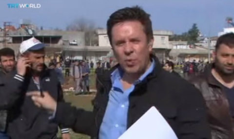 Репортер на TRT World обясняваше пред камерата къде са попаднали снарядите, когато нов такъв удари сграда, намираща се на няколкостотин метра от него.