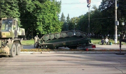 Бойна верижна машина се обърна на улица в украинския град Конотоп, съобщи телевизия "112 Украина".