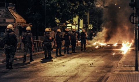 Протестиращите запалили няколко кофи за боклук и хвърляли коктейли Молотов срещу полицаите. Те издигнали лозунги срещу предлаганите от правителството на СИРИЗА мерки за орязвания на социалните плащания и заплати.
