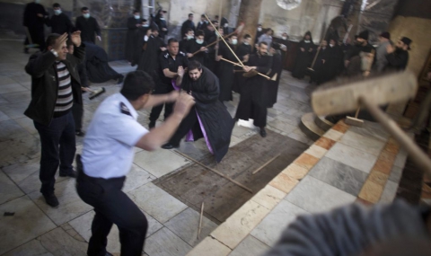 Гръцки и арменски монаси се биха с юмруци и метли по време на традиционното почистване на храма „Рождество Христово“, предаде Ройтерс.