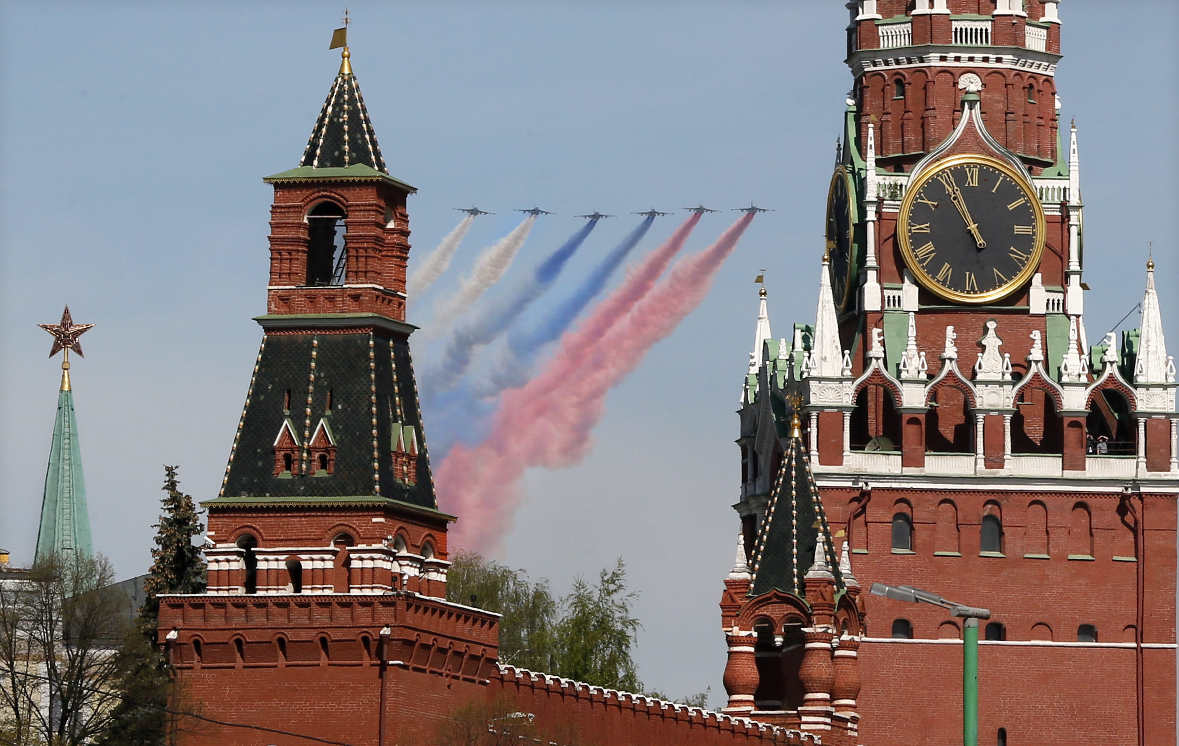 За финал на парада три самолета разпръснаха в небето цветен дим в багрите на руския трикольор.