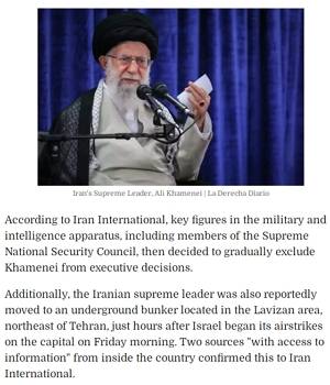 Според Iran International, върховният лидер на Иран Али Хаменей е бил отстранен от вземането на най-важните стратегически решения от оцелелите висши военни командири поради сериозен психически срив.Психическият упадък на лидера е започнал да става очевиден след убийството на няколко от най-доверените му хора при израелски въздушни удари, насочени към цели на Революционната гвардия.
