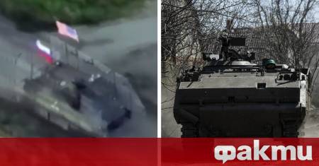 В украинските медии и социалните мрежи се появи странно видео, в което бронетранспортьор на руската армия, със знамена на Русия и САЩ, атакува позиции на украинските сили.